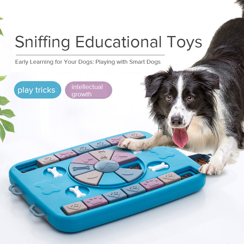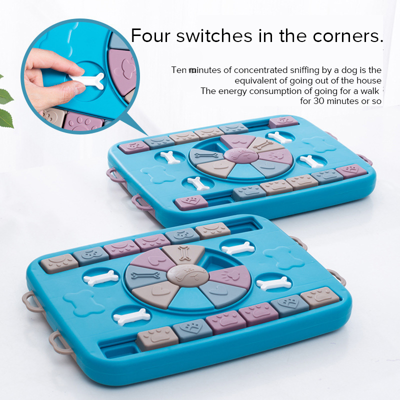 Fabricado en plástico resistente, no tóxico y seguro para mascotas, su estructura cuenta con medidas de 34.5 cm x 26 cm x 3.5 cm, lo que lo hace práctico y fácil de usar en cualquier espacio. Los compartimentos ocultos permiten esconder croquetas o snacks, incentivando a tu perro a utilizar el olfato y la memoria para resolver el rompecabezas.